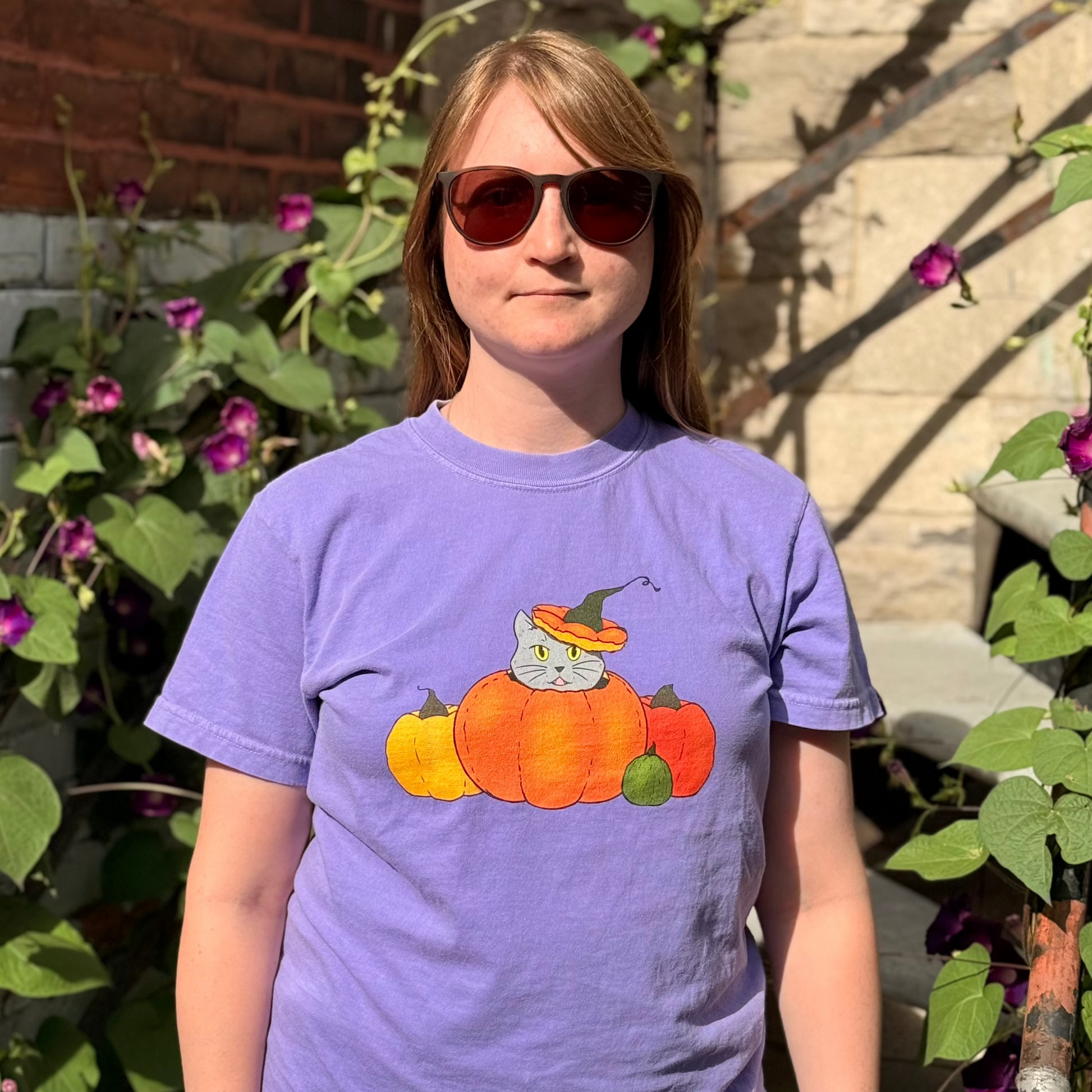 Pumpkin Cat is the perfect companion to keep you company throughout the fall festivities in this premium cotton t-shirt.